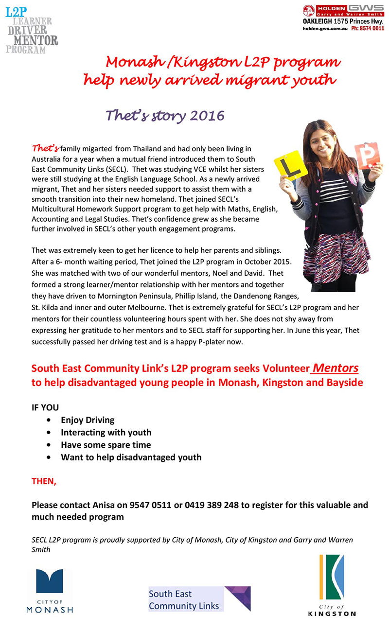 One of my passions is to improve road safety. I believe that driver training and education are integral in reducing deaths and serious injuries on our roads. Through Southern Ethnic Advisory and Advocacy Council (Seaac), I completed a three day mandatory training course in February 2016 to become a mentor driver for the Learner to Probationary licence program (L2P).